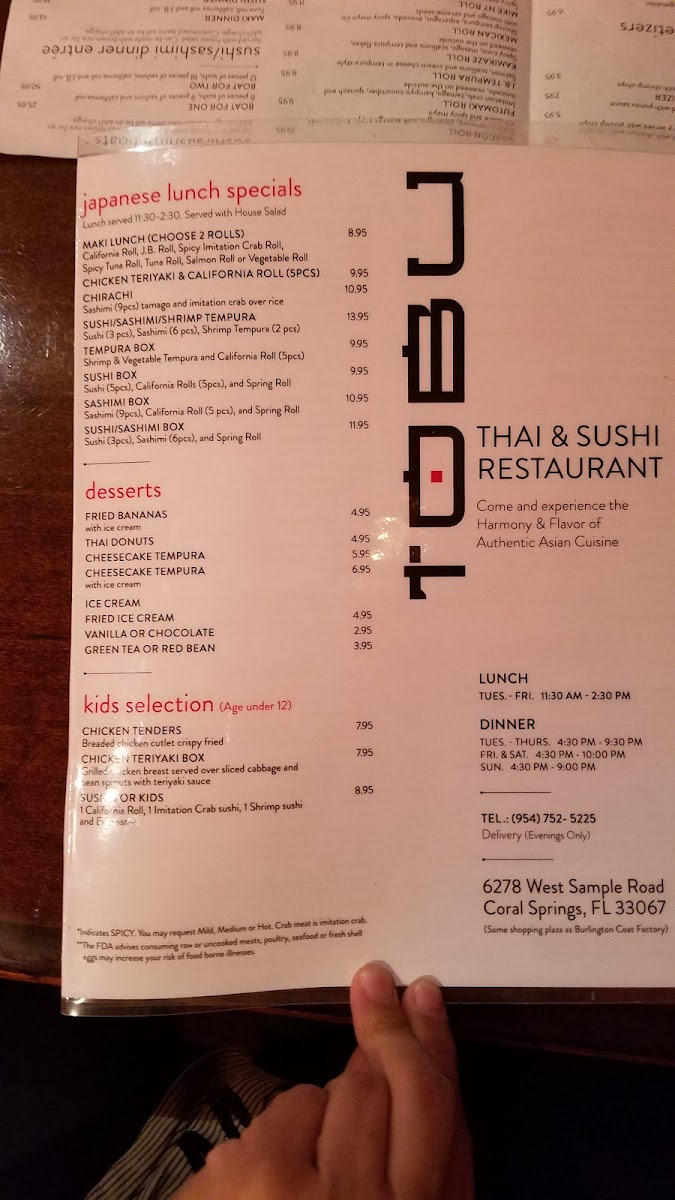 When you step into Tobu Thai & Sushi, located at 6287 W Sample Rd #3175, Coral Springs, FL, you’re in for a treat. The Tobu Thai & Sushi Menu offers a perfect blend of vibrant Thai flavors and fresh, expertly crafted sushi. From bold, aromatic curries to delicate rolls, there’s something for every craving. Whether you're in the mood for a classic Pad Thai, spicy green curry, or a mouthwatering dragon roll, each dish is prepared with care and the finest ingredients. The menu is designed to take your taste buds on a journey, making it the ideal spot for a casual dinner or a special night out. The combination of traditional Thai dishes and innovative sushi options ensures that every visit is a new experience. You’ll find yourself returning time and again to explore the delightful variety and unbeatable flavors!